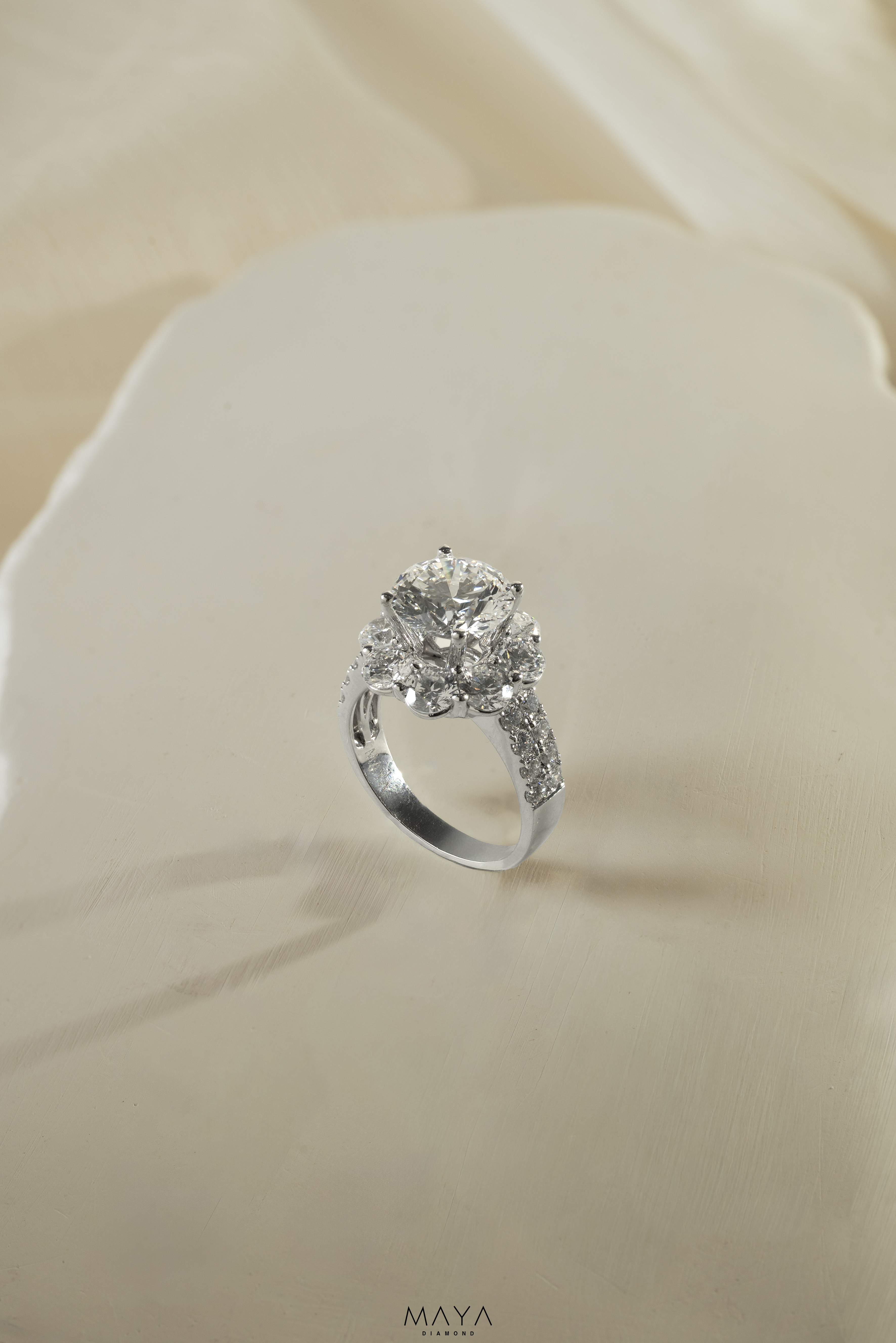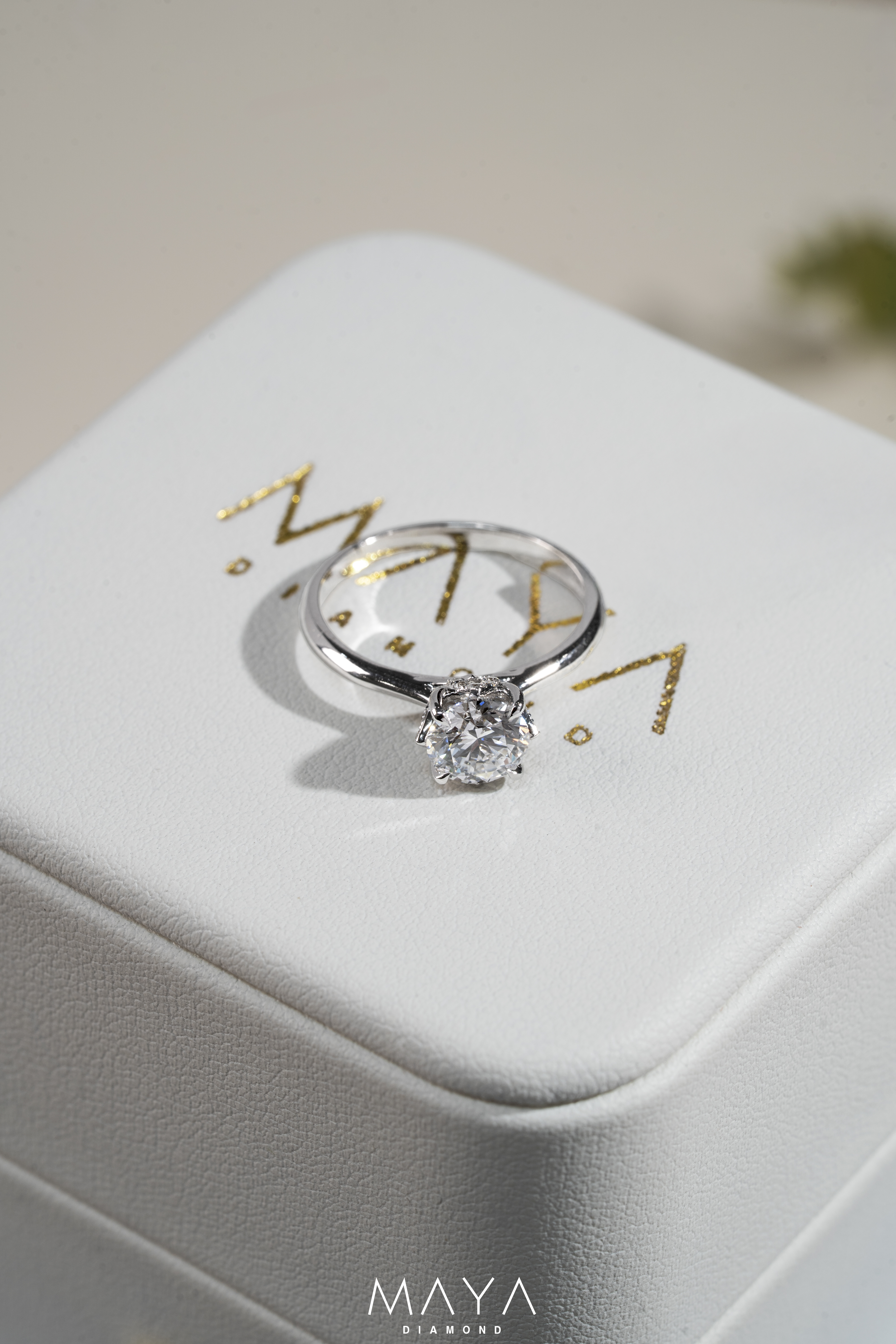 Nhẫn viên chủ Round 2.0ct, ổ nhẫn có thiết kế cánh hoa độc đáo, vỏ nhẫn trơn