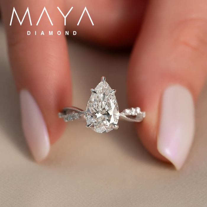 Nhẫn viên chủ Pear 2.0ct ổ kết 2 viên kim tấm Pear, vỏ nhẫn trơn