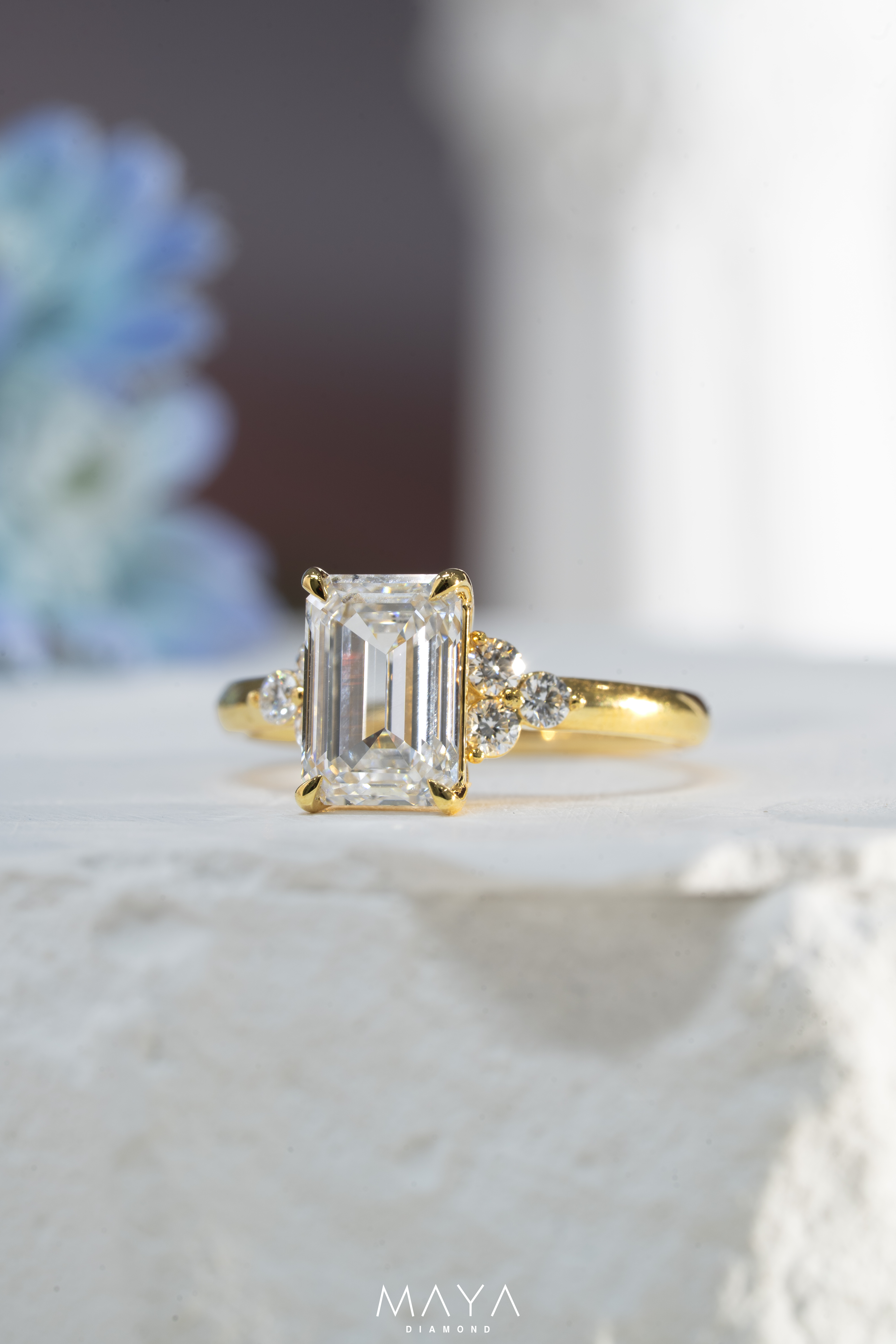 Nhẫn viên chủ Emerald 3.0ct kết 2 viên Baguette hình thang bé, vỏ nhẫn trơn